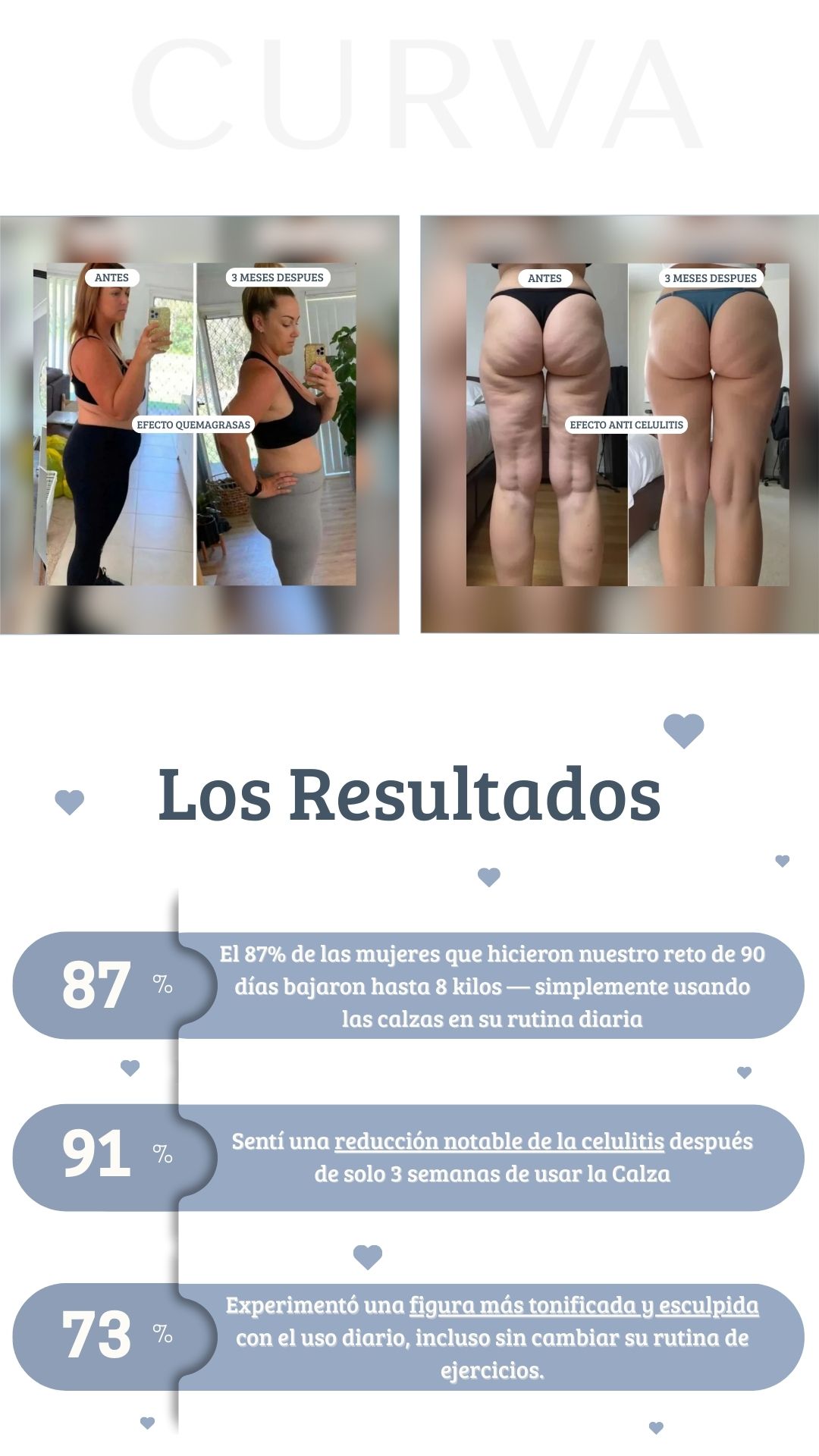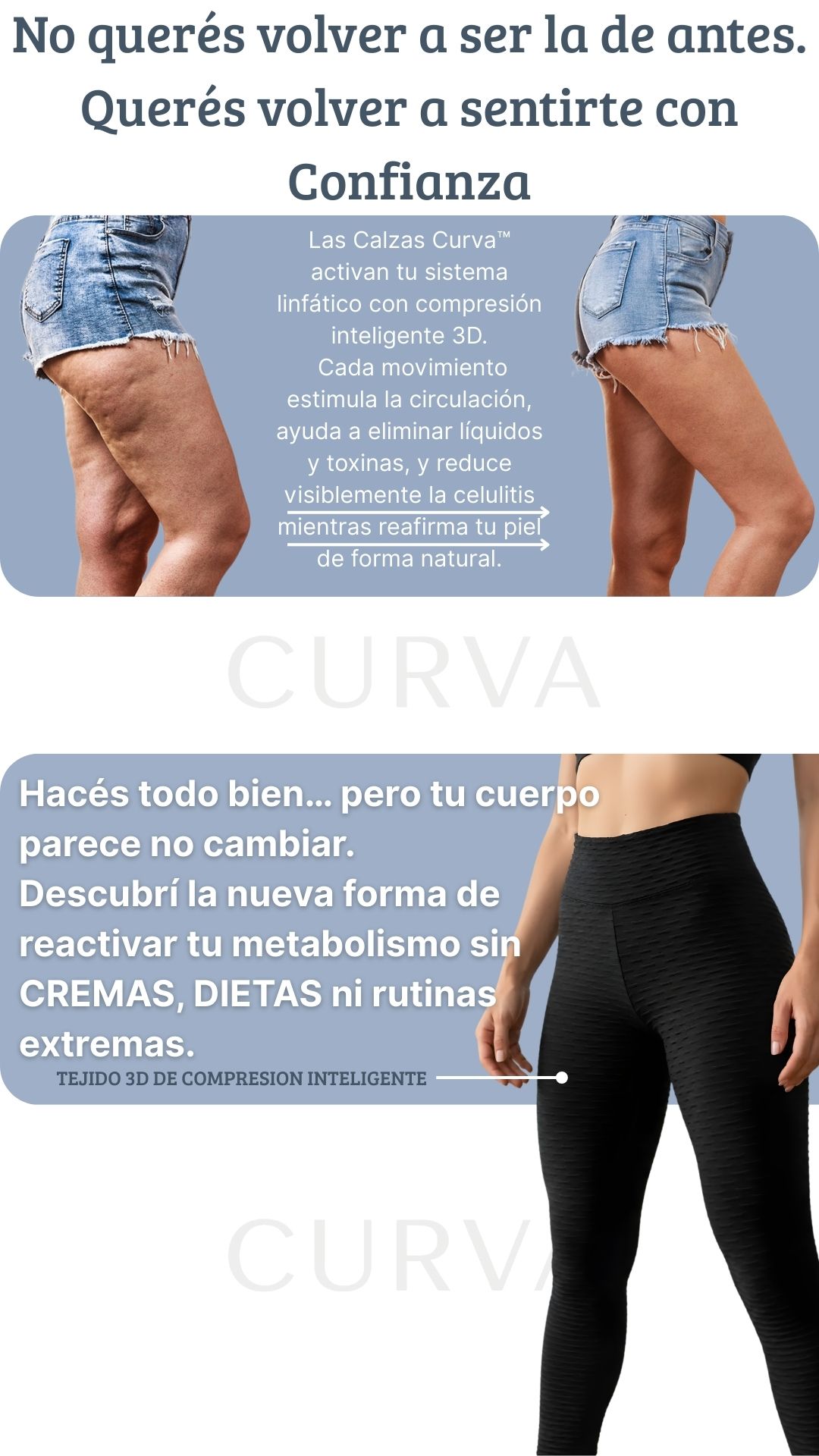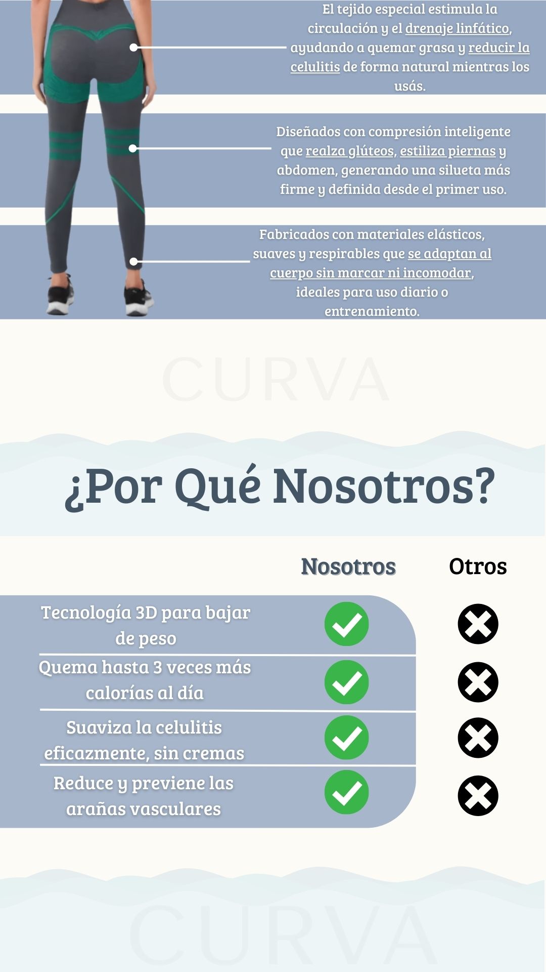 La compresión 3D de nuestras Calzas crea resistencia muscular, obligando a tus piernas a trabajar de 2 a 3 veces más que sin ellas. Al trabajar más, tus músculos queman más calorías para producir energía, lo que te ayuda a perder peso 3 veces más rápido.